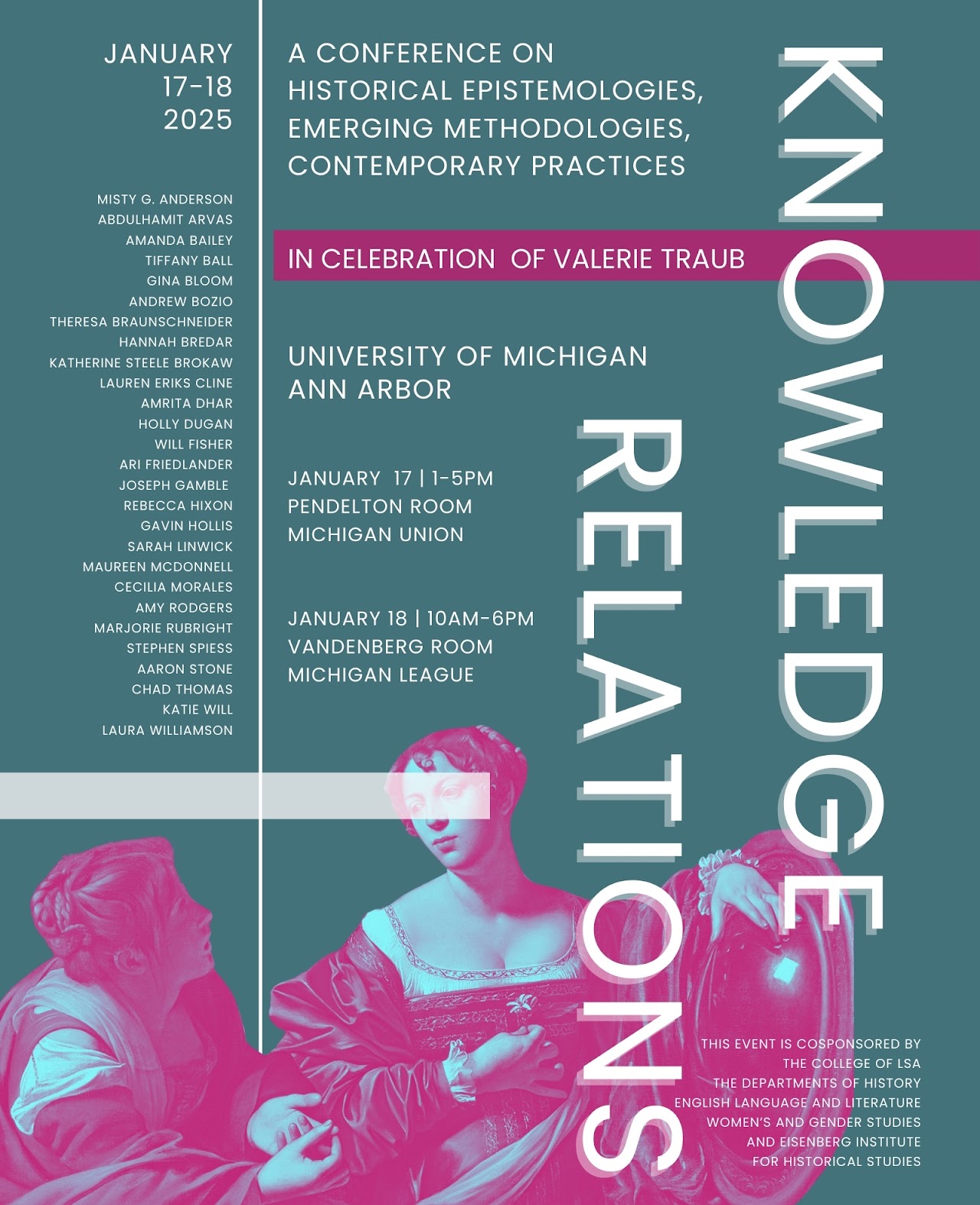 “Knowledge Relations,” a conference I co-organized in honor of Valerie Traub, was held on January 17-18, 2025 at the University of Michigan.